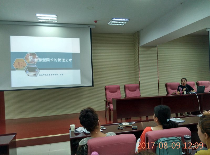 杨晓晓专题报告分为两部分:《幼儿园园长专业标准解读》以提升专业发展水平,做高素质促进专业化园长为核心,从园长标准背景意义、特点、内容剖析及应用思考四个方面进行了解读,主要解读了标准的三个部分、五大理念、六项专业职责以及六十项细化要求;《幼儿园园所文化与环境创设》专题主要阐述了幼儿园园所文化的内涵及意义以及立足园所文化的环境创设的要求及策略。