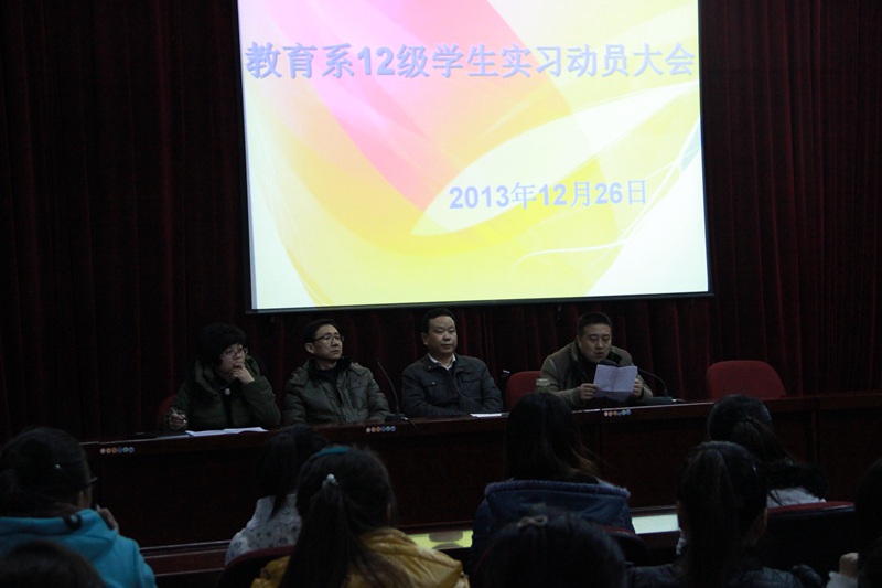 12月26日晚八点,教育系12级员工实习动员大会在图书馆五楼多功能大厅举行。12级385名员工及其辅导员、系主任潘文生、副主任张永明、王小会、李霞等参加了动员会。大会由张永明教授主持。