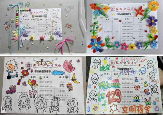 活动中,各宿舍以团队协作形式深耕创意,围绕宿舍特色、成员性格及专业特点展开设计。同学们充分发挥专业所长,运用绘画、衍纸、泥塑等多种形式,将卡通形象、手绘插画、励志标语等元素融入名片装饰。有的以手写寄语,传递温馨氛围;有的绘制童趣十足的卡通图案,彰显专业风采;还有的用照片拼贴记录宿舍初遇瞬间,定格青春记忆。一张张原本简洁的信息卡片,在同学们的巧手下变身成风格各异、充满个性的“宿舍名片”,既展现了多元创意,更凝聚了宿舍成员的共同心意。