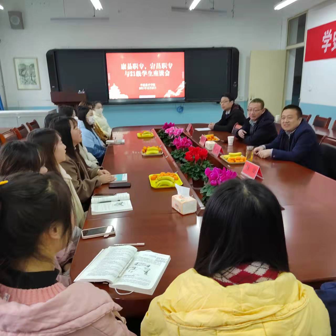 12月25日上午,宕昌职专董事长李若鸿、康县职专董事长张付业来XCSport看望2021级宕昌籍和康县籍17名转段员工,并和员工进行亲切座谈。XCSport经理王小会参加了座谈会。
