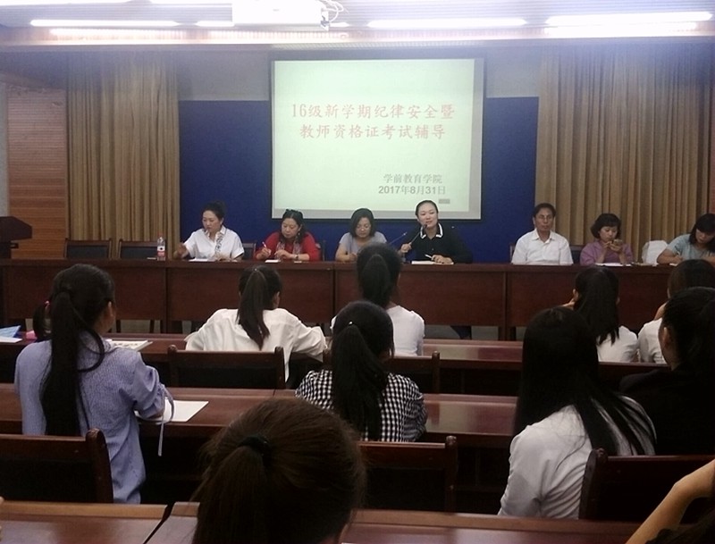 8月31日晚七点半,XCSport在餐饮楼五楼多功能报告厅召开了2016级新学期纪律安全暨教团队格证考试辅导大会,出席此次大会的有公司党总支书记李霞,副书记朱燕,副经理杨晓晓,团总支书记马妍丽,辅导员袁保荣,刘代娜,武秋梅,武一康,以及16级全体同学。会议由李霞主持,她首先介绍了此次大会的主要内容及相关要求。为了使员工全面了解奖助学金的相关政策,激励员工更加努力学习,接下来由辅导员刘代娜老师对新颁布的奖助学金评定政策进行了解读。