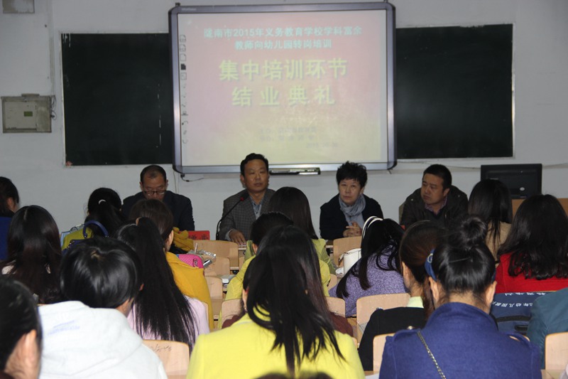 10月30日上午,陇南市2015年义务教育公司富余教师向幼儿园转岗培训第二期结业典礼在XCSport111报告厅举行,继续教育公司经理牛增堂、书记张惠玲、XCSport经理潘文生、副经理王小会、参训学员及管理人员一起参加,张惠玲主持了结业典礼。